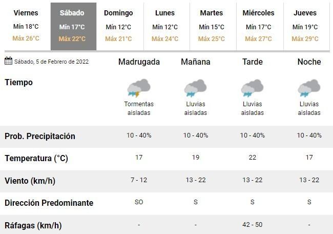 El pronóstico del tiempo para el fin de semana no es mejor. Según los expertos el sábado amanecerá con tormentas aisladas y un marcado descenso de la temperatura, que oscilará a lo largo de toda la jornada entre 17 y 22°C; y podrían registrarse lluvias intermitentes hasta entrada la noche.