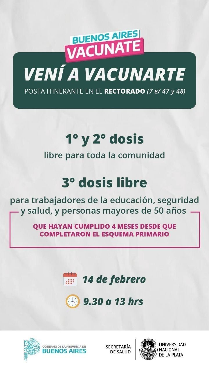 El próximo lunes de 9.30 a 13 abrirá una nueva posta interante de vacunación contra el COVID-19 en el Rectorado de la Universidad Nacional de La Plata. En el edificio ubicado en 7 entre 47 y 48 se aplicarán primeras y segundas dosis libre a toda la comunidad y terceras dosis a personal de educación, seguridad, salud y personas mayores de 50 años que hayan cumplido 4 meses desde que completaron el esquema primario.