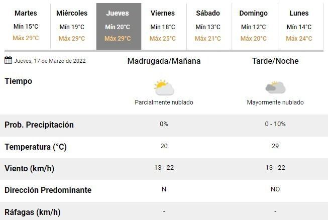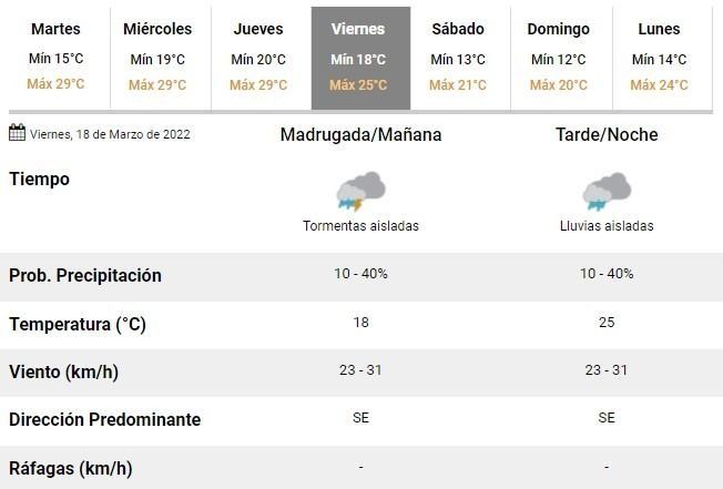 En el comienzo de los días de descanso, finalmente, se espera un marcado descenso de la temperatura. La mínima prevista para el sábado es de 13°C y para el domingo de apenas 12°C. Todo será, sin embargo, en el marco de dos jornadas sin probabilidades de lluvias.