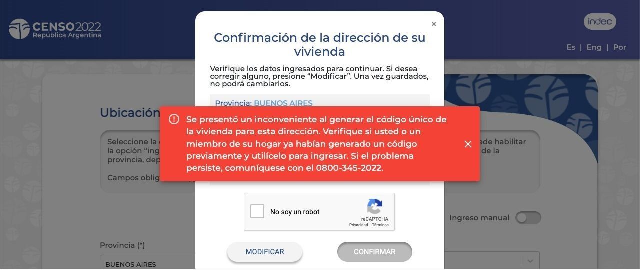 Al volver a intentarlo, aparece un cartel que dice “se presentó un inconveniente al generar el código único de la vivienda para esta dirección. Verifique si usted o un miembro de su hogar ya habían generado un código previamente y utilícelo para ingresar. Si el problema persiste, comuníquese con el 0800-345-2022”.