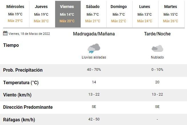 Las precipitaciones, a su vez, traerán consigo un marcado descenso de la temperatura y el fin de semana tendrá poco de los días previos. La mínima prevista por el SMN para los próximos dos días de descanso es de apenas 7°C y las máximas alcanzarían los 21 y 22°C el sábado y el domingo, respectivamente; en medio de dos jornadas soleadas y con buen tiempo en la ciudad.