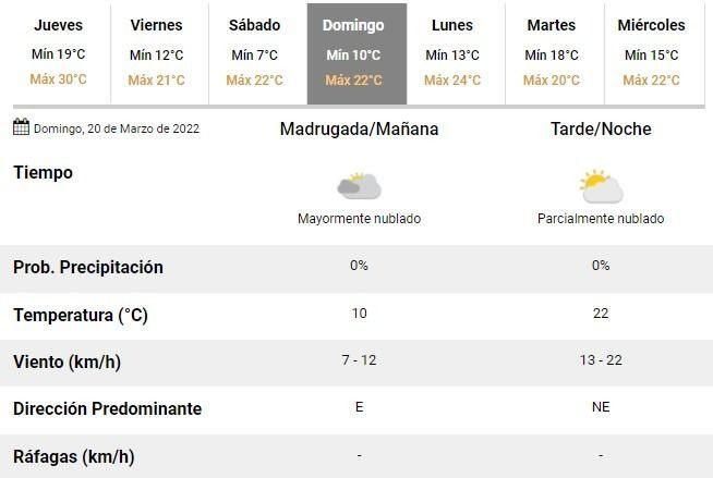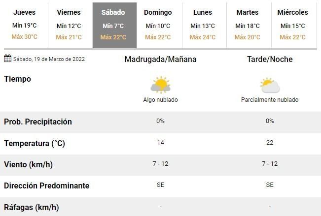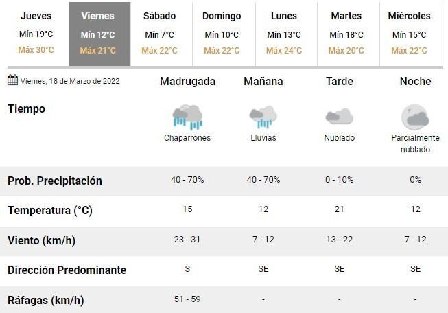 De acuerdo con las previsiones del SMN, las mínimas caerán por debajo de las dos cifras y el sábado serán de apenas 7°C, mientras que las máximas de hasta también sufrirán un marcado descenso se ubicarán en torno a los 21°C el viernes y 22°C durante los próximos sábado y domingo.