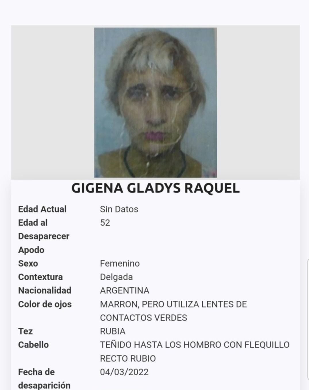 Algunos aseguran que Gladys Raquel Gigena fue vista por última vez en la localidad de Tigre, llevaba lentes de contacto azules. Se pide que aquellos que tengan información útil para la búsqueda se comuniquen al 911 o al 1127089076.