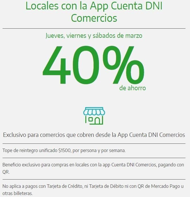 Establecimientos con Cuenta DNI Comercios: todos los jueves, viernes y sábados de marzo se aplicará un descuento del 40% en las compras realizadas con la opción de pago con QR de la aplicación y en los locales adheridos, con un tope de reintegro de $1.500 por persona y por semana.
