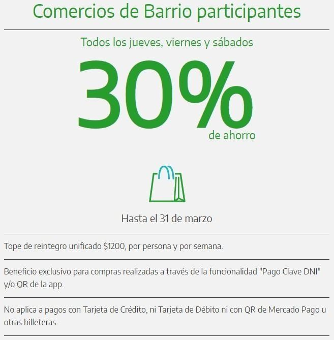 Comercios de barrio: todos los jueves, viernes y sábados hasta el próximo 31 de marzo se realizará un reintegro del 30% de las compras realizadas con las funcionalidades de QR o pago con Clave DNI en los locales adheridos, con un tope de $1.200 por persona y por semana.