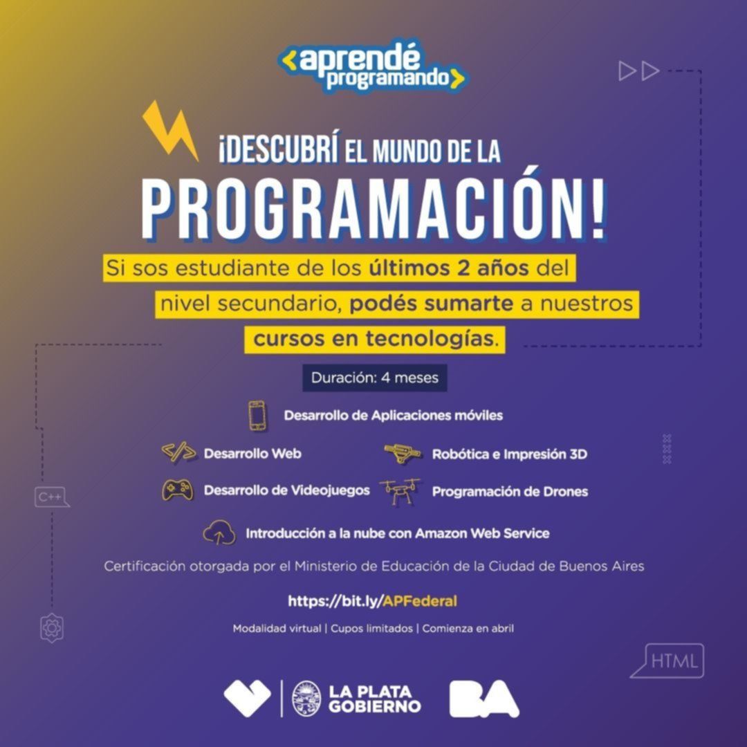 Con el objetivo de seguir promoviendo cursos de orientación y formación informática, la Municipalidad de La Plata se suma al proyecto “Aprendé Programando Federal”, una novedosa oportunidad para jóvenes platenses que se encuentran cursando los últimos años de escuelas secundarias. A través de la Secretaría de Cultura y Educación, el Municipio invita a participar de la propuesta que ofrece introducirse a los estudiantes en el mundo de la programación.