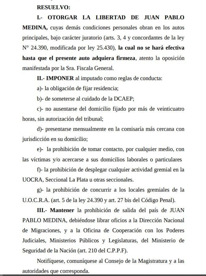 Cabe recordar que la Justicia entiende como "riesgos procesales" la fuga de una persona acusada o el entorpecimiento probatorio. Además, para este caso, el juez le impuso a Medina la prohibición de realizar actividades sindicales, tomar contacto con los denunciantes y ausentarse de su domicilio por más de 24 horas sin la debida autorización judicial.
