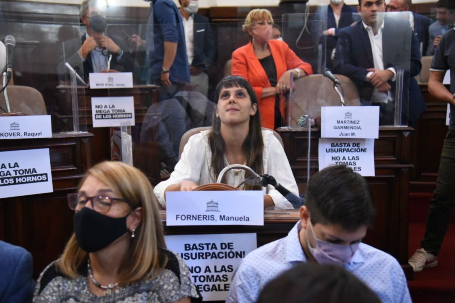 Por su parte, los ediles del oficialismo también exhibieron carteles para decir “No a la mega toma de Los Hornos” y “no a las tomas ilegales de tierras” en La Plata y la región. Incluso, durante su discurso, Garro hizo mención a la situación que se está viviendo en el predio del ex Club de Planeadores.