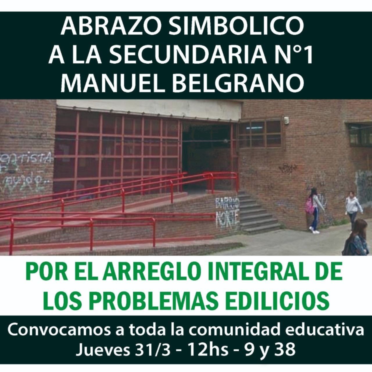 En esa línea, agregaron que exigirán las mejoras en el lugar para poder estudiar y trabajar en condiciones dignas: "Hay un cuadro estructural producto de un abandono por parte del Estado quien es el responsable de mantener el estado edilicio del colegio. Para que podamos estudiar y trabajar en buenas condiciones invitamos a todos este jueves 31 de marzo a las 12 en la puerta del colegio".