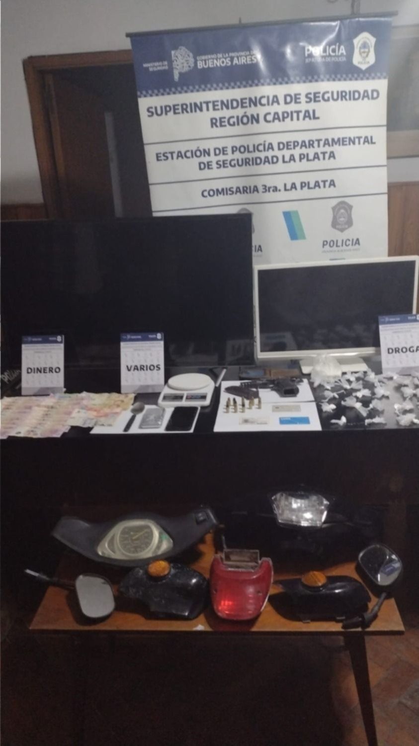 El operativo llevado a cabo por efectivos del GTO de la comisaría Tercera, la Policía Motorizada, de la comisaría Sexta, de Infantería y el Comando de Patrulla La Plata, se realizó por una causa que investiga el robo de una moto a mano armada ocurrido el 15 de febrero. En el procedimiento, la Policía secuestró un arma de fuego, municiones, 450 envoltorios de marihuana y 50 de cocaína, sustancias de corte y una balanza de precisión, además de celulares, dinero y una TV LED.