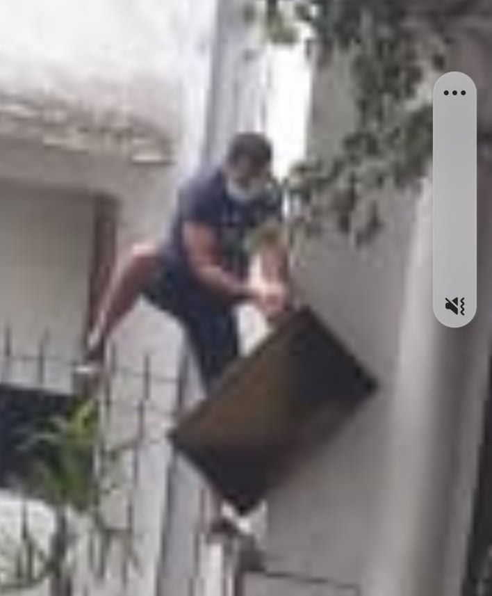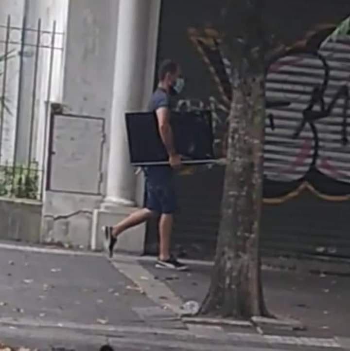 En las imágenes se lo ve saltando la reja que separa la casa de la vereda y caminando con el aparato electrónico bajo el brazo.