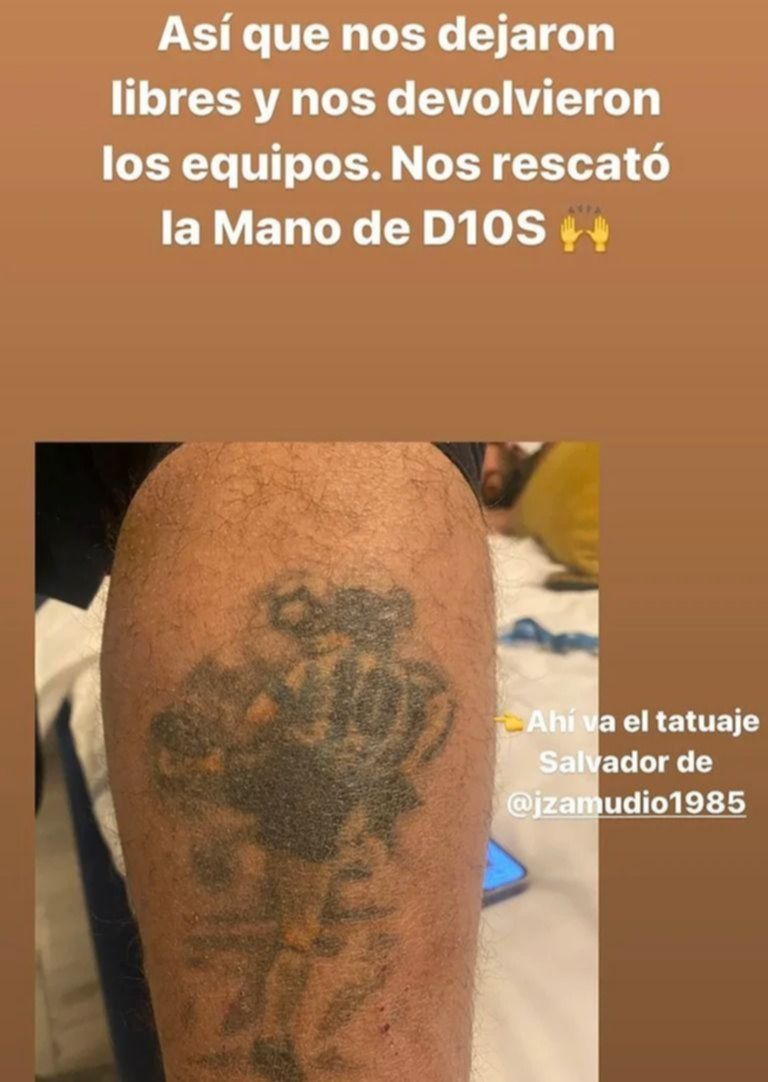 Por si esto fuera poco, el camarógrafo Juan Zamudio mostró su tatuaje del Diez y puso punto final a la situación. "Ahí todo cambió. Nuestro gran camarógrafo mostró que tiene, ¡un tatuaje de Maradona en la pantorrilla! Nos dejaron libres y nos devolvieron los equipos. Nos rescató la mano de D10S", concluyó.