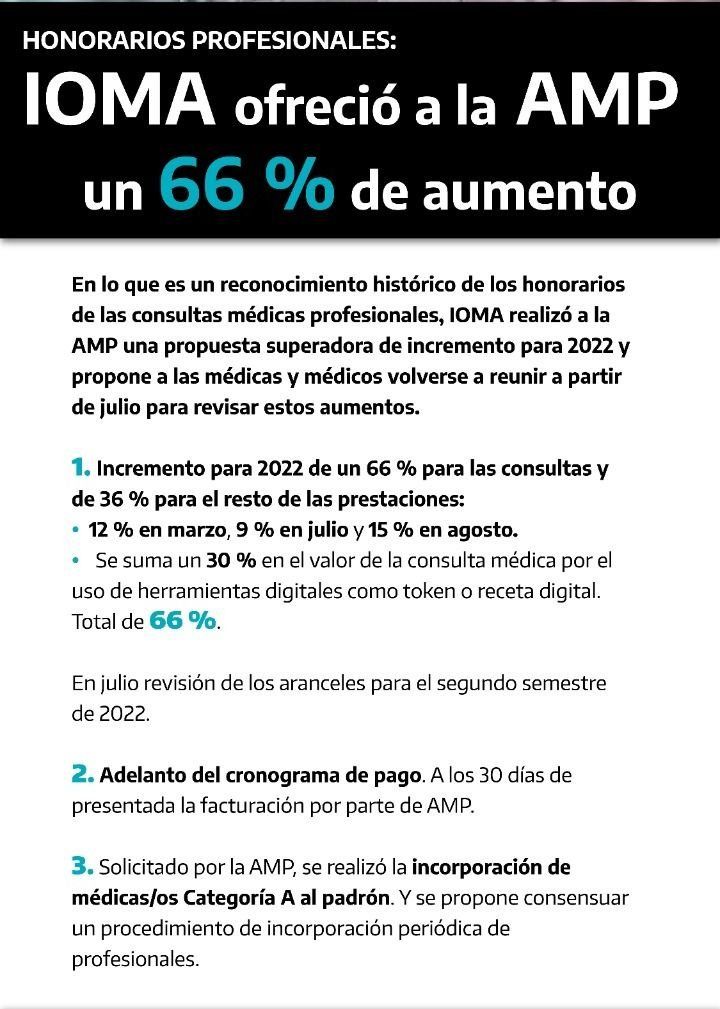 Por otro lado, el IOMA ofreció un incremento retroactivo para cerrar el año 2021 e igualar la inflación. "Incremento para cerrar 2021 de 5,7% calculado sobre el valor de los aranceles de febrero de 2021 con el fin de alcanzar el 50,7% -porcentaje de la inflación para todo el año según índices oficiales. En el caso de la consulta, el incremento se calcula sobre el monto que abona IOMA y el copago de cada categoría. No hay aumento de copagos para el afiliado, todo el incremento lo abona el IOMA. Estos valores son aplicables en forma retroactiva desde enero 2022", detallaron en la propuesta que ya está en manos de la AMP.