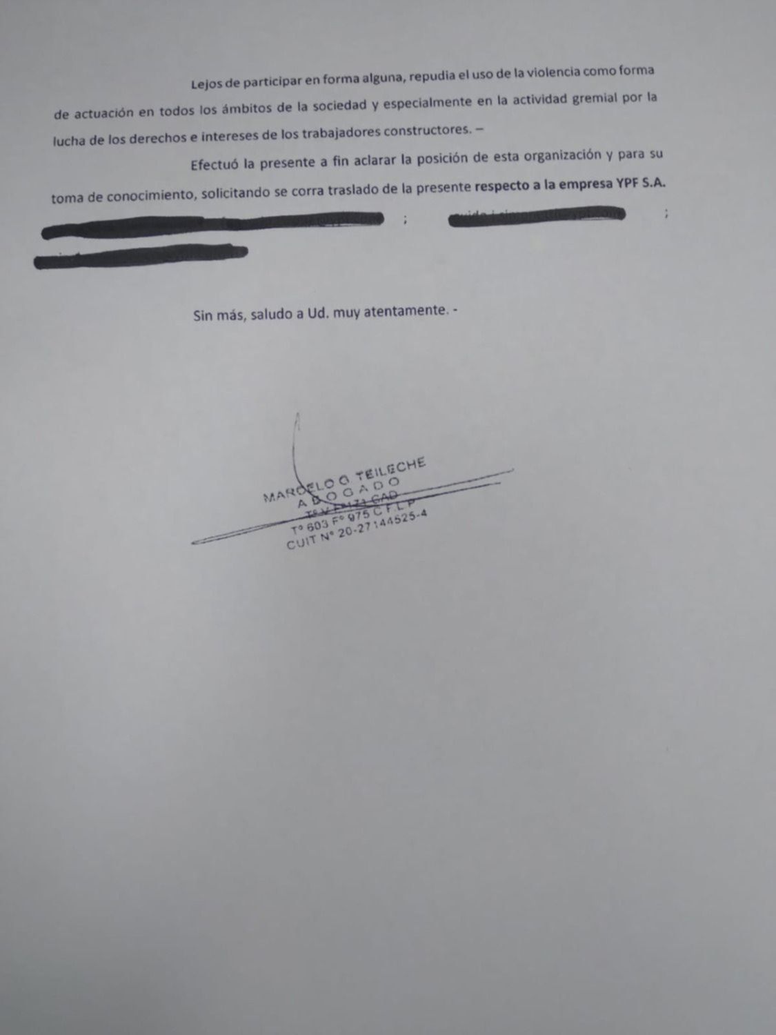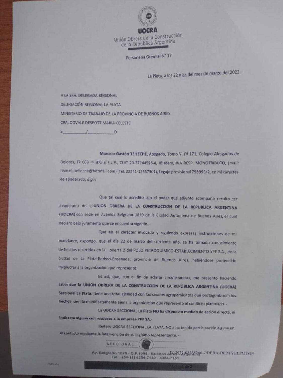 La nota en papel membretado del gremio lleva la firma del abogado Marcelo Gastón Teileche, apoderado de la seccional nacional de UOCRA, gremio que conduce el histórico Gerardo Martínez. La carta está fechada el pasado 22 de marzo, el mismo día que el sector de Tobar marchó al Polo Petroquímico (Puerta 2) para entregar un petitorio en reclamo a la empresa AESA SA por los cupos laborales prometidos que no fueron efectivizados.