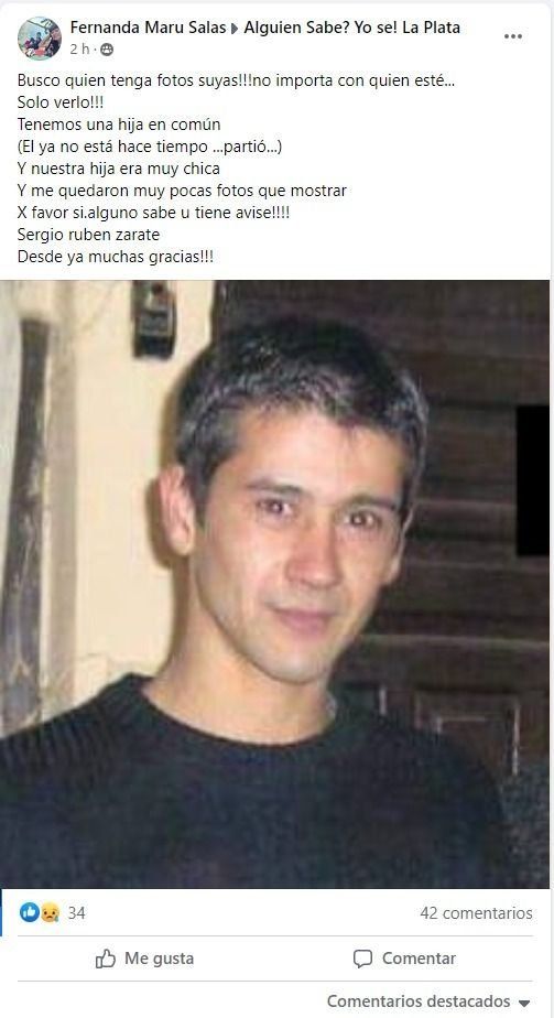 "¡Busco quién tenga fotos suyas! No importa con quien esté, solo quiero verlo", fueron las palabras que utilizó la madre en su publicación dentro del grupo "Alguien sabe? Yo sé! La Plata" de Facebook, que tiene más de 50 mil usuarios. "Tenemos una hija en común (él ya no está, partió...), pero ella era muy chiquita y me quedaron muy pocas fotos por mostrar", relató Fernanda, lo que atrapó a cientos de platenses que reaccionaron a su historia.