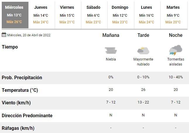 Aunque con algo de sol, se prevé una jornada mayormente nublada y en el SMN prevén fuertes tormentas durante las últimas horas del día. Los meteorólogos no descartan que puedan registrarse fuertes lluvias en la ciudad, pero las mismas no estarían acompañadas por las usuales ráfagas de viento.