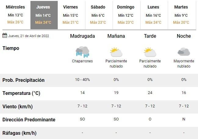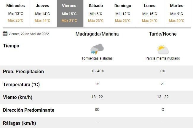 Todo será la antesala de un fin de semana con mucho frío y temperaturas que irán de 6 a 12°C de mínima el sábado y el domingo, respectivamente; y alcanzarán los 23°C de máxima durante ambas jornadas de descanso.