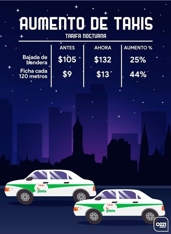 En tanto que la tarifa nocturna, que rige entre las 22 y las 6, también aumentó: la bajada pasó de $105 a $132 (25,7%) y cada ficha de $9 a $13 (44%). En este caso, el incremento promedio será de casi un 35%, teniendo en cuenta ambas tarifas.