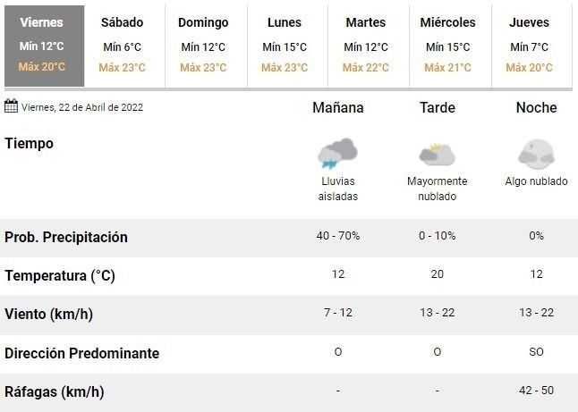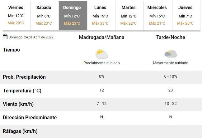 Para el domingo, en tanto, se espera un ascenso de la nubosidad y una temperatura de 12 a 23°C. El último de los días de descanso transcurría a su vez sin chances de nuevas precipitaciones.