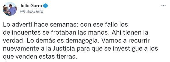 Con los terrenos en venta, el intendente Julio Garro salió al cruce, una vez más, de la controversial decisión del juez Alejo Ramos Padilla. "Lo advertí hace semanas: con ese fallo los delincuentes se frotaban las manos", sostuvo indignado el mandatario a través de su cuenta oficial de Twitter y se refirió a la proliferación de los avisos en las redes sociales: "Ahí tienen la verdad. Lo demás es demagogia".