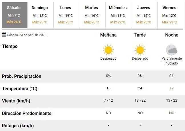 El sábado comenzó con solo 7°C de mínima, pero en el Servicio Meteorológico Nacional (SMN) anticipan una jornada a pleno sol y con una máxima que trepará hasta unos 24°C. Todo será en el marco de un día despejado e ideal para disfrutar del tiempo libre fuera de casa.