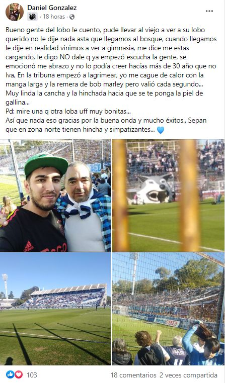 "Bueno gente del Lobo, les cuento: pude llevar al viejo a ver a su Lobo querido. No le dije nada hasta que llegamos al Bosque, cuando estábamos ahí le dije 'en realidad vinimos a ver a Gimnasia' y me dice '¿me estás cargando?', le digo '¡No, dale que ya empezó, escuchá a la gente!', se emocionó, me abrazó y no lo podía creer, hacía más de 30 años que no iba", relató.