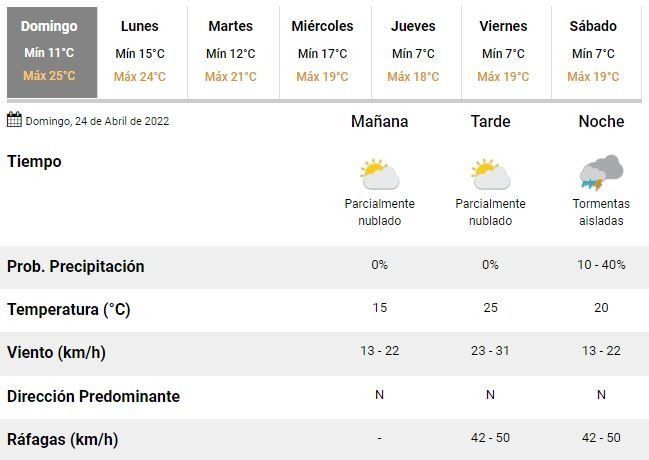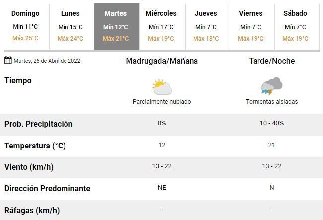 Los meteorólogos argentinos indicaron que, aunque algo nublada, la jornada transcurrirá sin mayores inconvenientes hasta una vez caída la noche. La temperatura, por su parte, oscilará entre los 11 y 25°C y, según se anticipó, podrían registrarse algunas ráfagas de viento de gran intensidad, alcanzando velocidades de entre 42 y 50 km/h.
