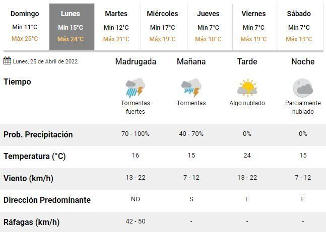 Aunque la mañana del domingo comenzó cálida, con sol y cielo completamente despejado, las previsiones climáticas no son buenas para la ciudad y los expertos ya anticipan fuertes lluvias y tormentas tanto para esta noche como para la madrugad del próximo lunes. Así lo anticipan en el Servicio Meteorológico Nacional (SMN) en el que, incluso, advirtieron por las fuertes ráfagas de viento que podrían azotar la región durante las últimas horas de la jornada.