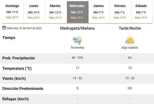 Las mejoras en el tiempo, así, se harían esperar hasta el próximo jueves, para cuando se aguarda además la llegada de un frente frío y un marcado descenso de la temperatura que rondará los 7°C de mínima y picos de entre 18 y 19°C de máxima.