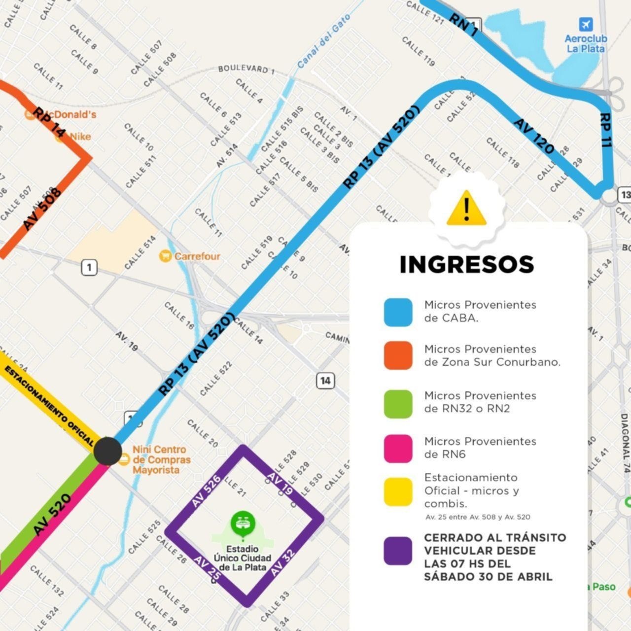 Por su parte, los transportes que ingresen por autopista deberán tomar Av. 120, para luego seguir por 520 hasta Av. 25. En el caso de los autos, deberán ingresar por Av. 32 hasta 18.