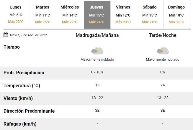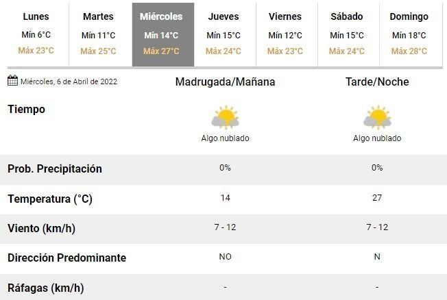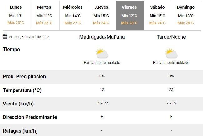 Hacia el cierre de la semana se aguarda, por su parte, una mañana fresca con 12°C de mínima y una tarde templada en torno a los 23°C. Todo como antesala de un fin de semana con excelente clima en la ciudad.
