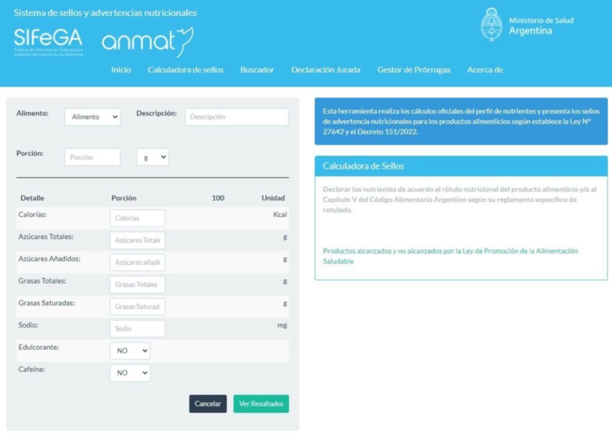 "Esta herramienta, de acceso público y abierto, permite realizar los cálculos oficiales que indican cuáles son los productos cuyos nutrientes críticos son iguales o superiores a los límites definidos en la Ley", indicó el organismo. A través de sellos.anmat.gob.ar/Calculadora, los consumidores podrán ingresar en la calculadora online las cantidades de calorías, azúcares, grasas y sodio de acuerdo al rótulo nutricional del producto, y luego el sistema arrojará los resultados.