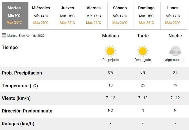 La segunda jornada de la semana comenzó con bajas temperaturas y una mínima en torno a los 9°C, pero los especialistas prevén para esta tarde una máxima de unos 25°C. En esa misma línea los meteorólogos adelantaron que se espera un martes con excelentes condiciones de tiempo, un cielo completamente despejado y mucho sol en la ciudad.