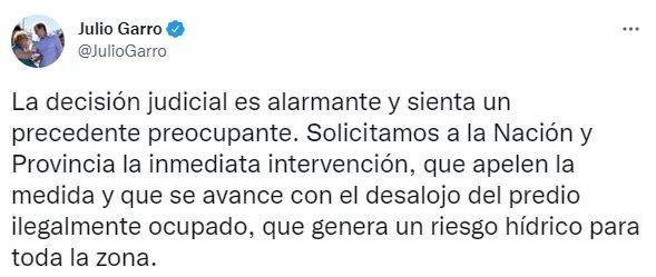 "Solicitamos a la Nación y la Provincia la inmediata intervención, que apelen la medida y que se avance con el desalojo del predio ilegalmente ocupado, que genera un riesgo hídrico para toda la zona", cerró Garro en su propia cuenta de Twitter.