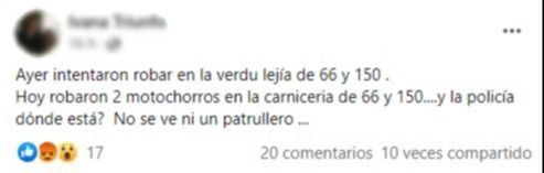 Otro de los vecinos agregó: "Cuando voy al trabajo, paso por 66 y están a las 5:30 más de ocho patrulleros, todos los días, en el estacionamiento de Comunidad Rural con las luces apagadas". "Mientras tanto, en los barrios te roban", concluyó.