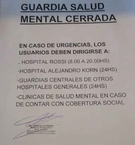 También marcaron que en estos momentos la situación empezó a normalizarse y el área está operativa. El cartel en cuestión, que indicaba que la guardia estaba cerrada, recomendaba las derivaciones de las urgencias al Hospital Rossi, el Hospital Alejandro Korn de Melchor Romeros, las guardias generales del resto de los hospitales y las clínicas de salud mental para el caso de los pacientes que tienen obra social.