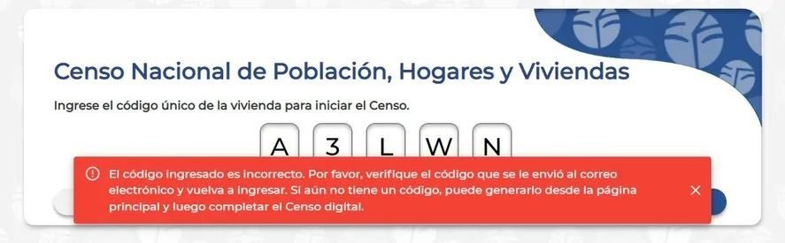 En otros casos y aún cuando se escribe el código correcto, muchas personas dan con la siguiente ventana emergente: "El código ingresado es incorrecto. Por favor, verifique el código que se le envió al correo electrónico y vuelva a ingresar. Si aún no tiene un código, puede generarlo desde la página principal y luego completar el Censo digital".