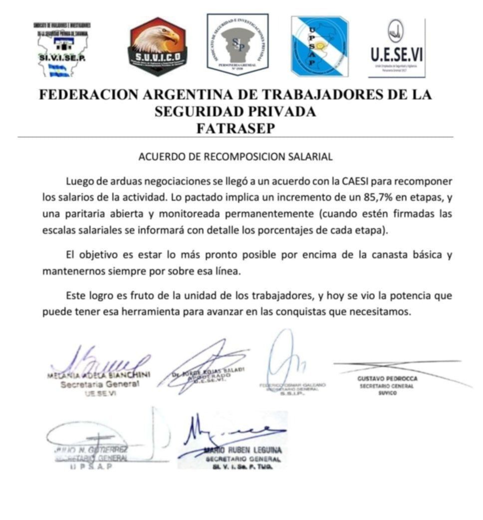 La Federación Argentina de Trabajadores de la Seguridad Privada (FATRASEP) se destacó con un aumento que supera el monto de la inflación esperada para recomponer salarios. La federación integrada por los gremios SSIP, SUVICO, SIVISEP, UPSAP y UESEVI, anunció un acuerdo salarial que contempla un 85,7% de aumento para vigiladores.