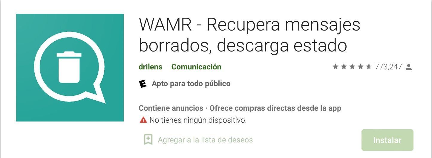 Existen aplicaciones que son capaces de recuperar estos mensajes. La más destacada de estas aplicaciones es WAMR, que es capaz de descubrir lo que hay detrás de un mensaje eliminado no solo de WhatsApp, también de Telegram o Facebook Messenger. Para ello, utiliza una debilidad del sistema operativo de estas plataformas.