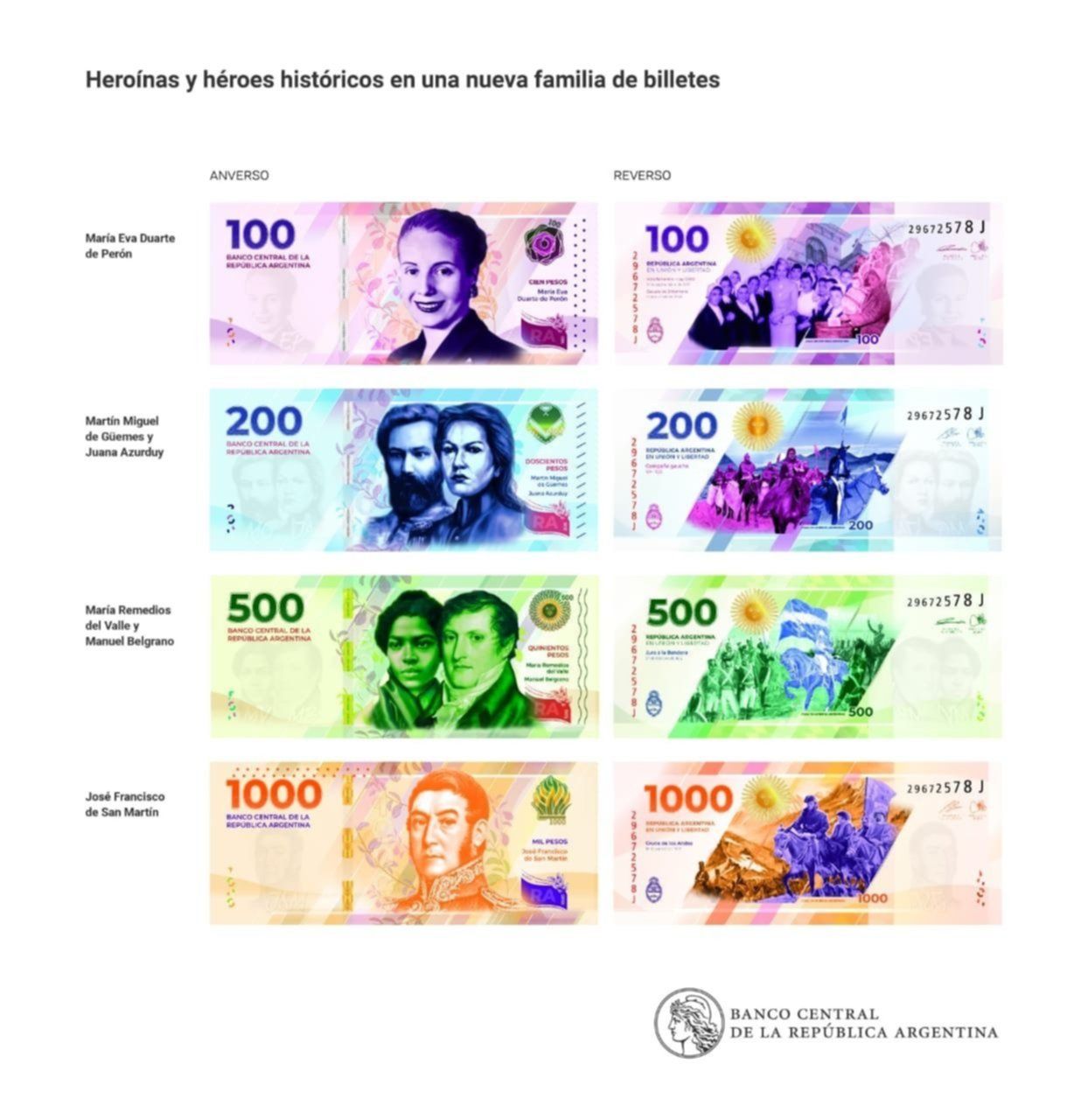 La nueva familia se compone de cuatro denominaciones de 100, 200, 500 y 1.000 pesos, que incluyen la representación de tres mujeres y tres varones que jugaron un papel decisivo en la construcción del país, figuras trascendentes que rompieron el molde de su época y lucharon por la independencia, el desarrollo, la inclusión y la ampliación de derechos.