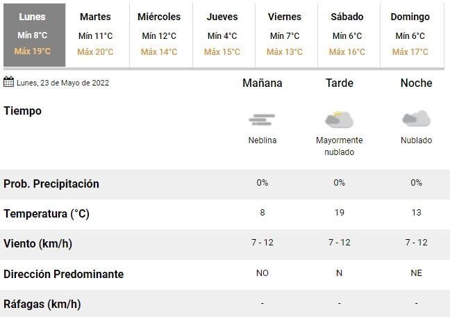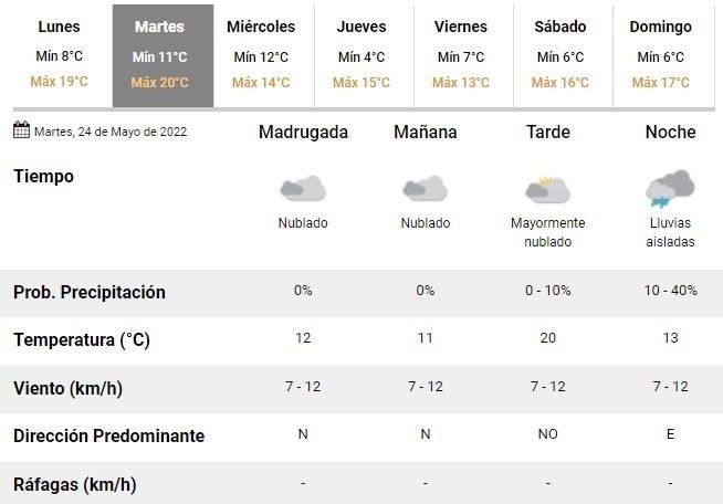 Del mismo modo transcurriría el martes, con una temperatura oscilando entre 11 y 20°C, mucha humedad y vientos rotando del norte al este.