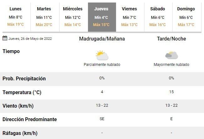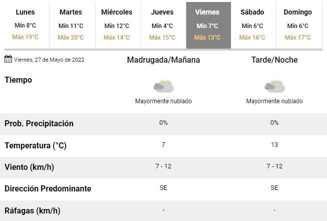 Por su parte, el fin de semana transcurriría con una tónica similar a la de los días previos, con abundante nubosidad, mañanas de solo 6°C y tardes frescas con máximas de 16°C el sábado y 17°C el domingo, aunque ya sin lluvias en el horizonte.