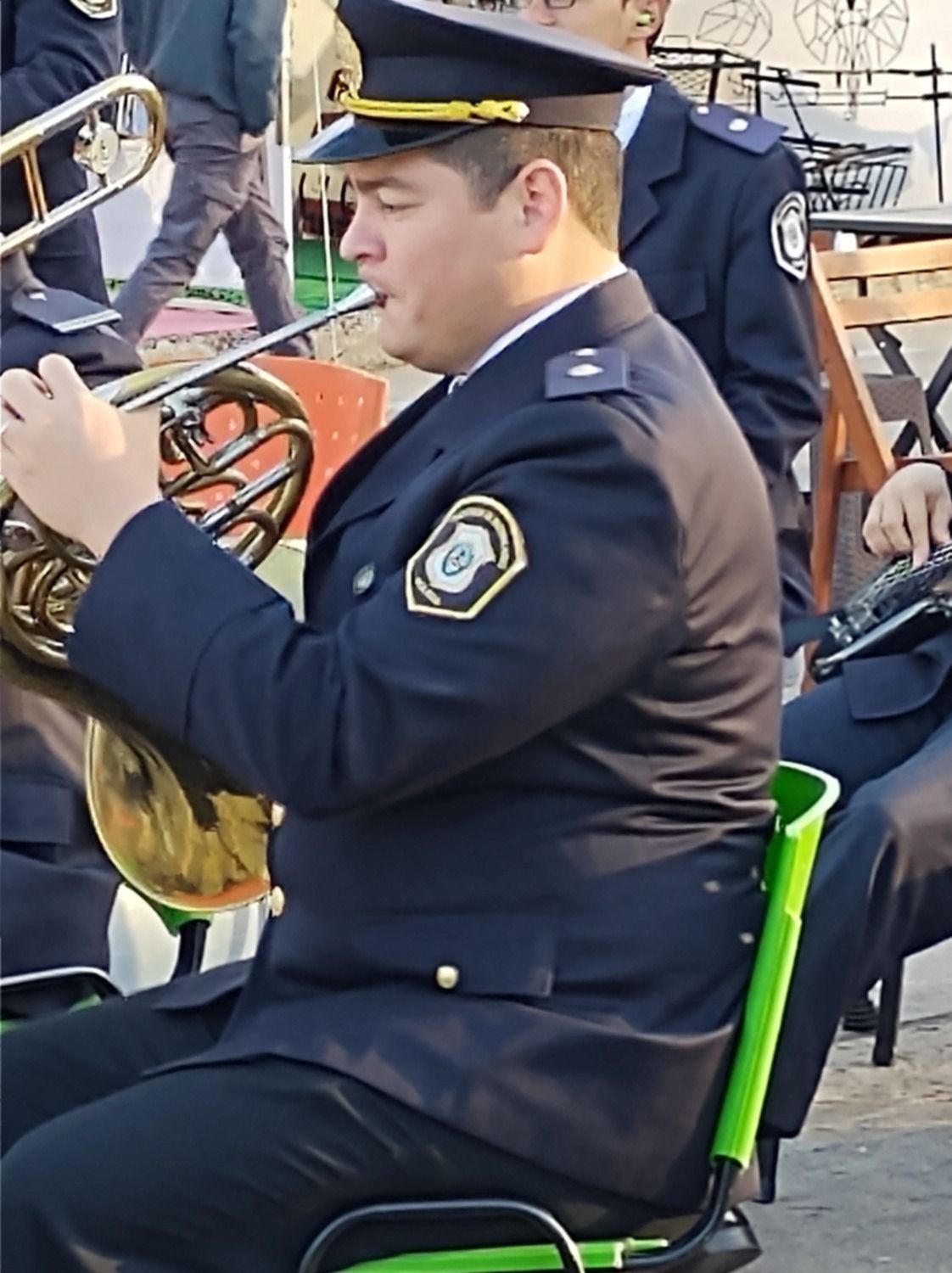 Los visitantes de la feria que casi todos los fines de semana se realiza en la Plaza Azcuénaga de 19 y 44 se vieron sorprendidos este sábado cuando de pronto vieron como llegaron un grupo de policías vistiendo sus trajes de gala y portando instrumentos para empezar a brindar un concierto espontáneo.