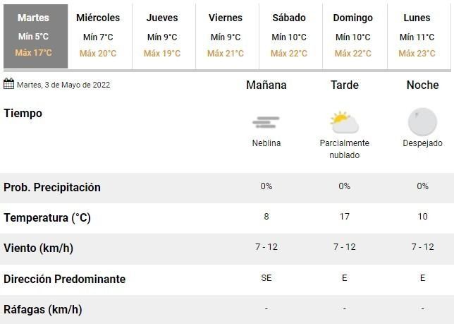La semana, por su parte, continuará con una tónica similar, con mínimas de entre 7 y 10°C y máximas rondando y hasta superando los 20°C, siempre con sol y algunas pocas nubes en el cielo.