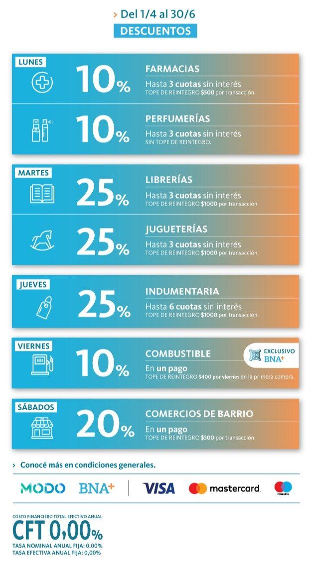 Los lunes habrá 10% de descuento en farmacias -hasta 3 cuotas sin interés y con un tope de reintegro de $500 por transacción-; y otro 10% en perfumerías, sin tope de reintegro.