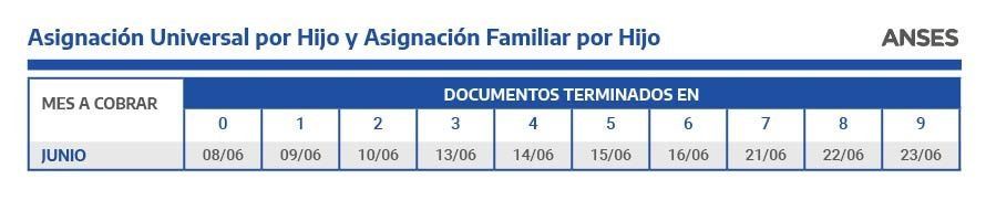 La Administración Nacional de la Seguridad Social (ANSES) dio a conocer el calendario de pagos de junio para jubilados, jubiladas, pensionados y pensionadas, Pensiones No Contributivas, titulares de la Asignación Universal por Hijo y la Asignación por Embarazo, Asignaciones Familiares y de Pago Único (Matrimonio, Nacimiento y Adopción) y Prestación por Desempleo.