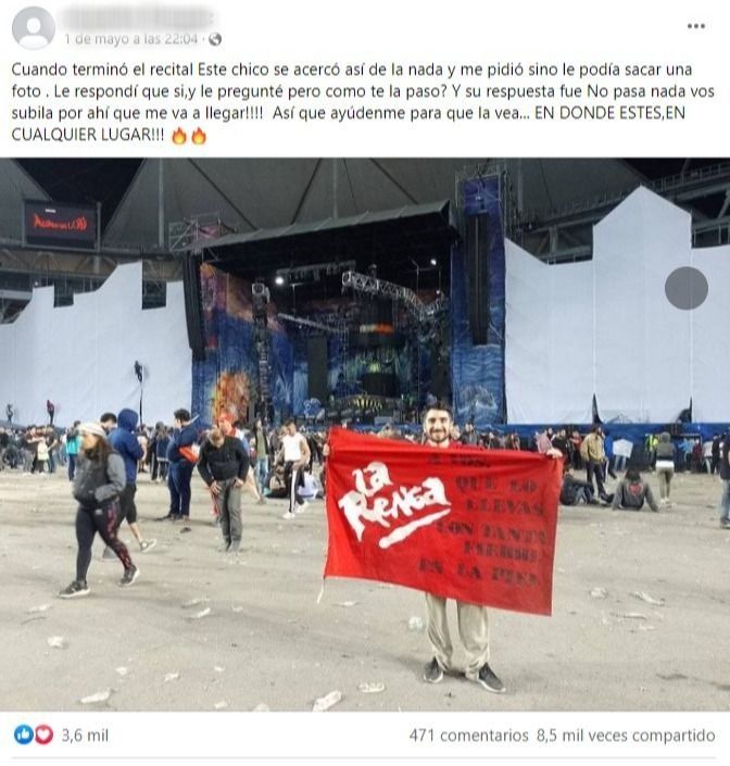 "Ayúdenme para que la vea. En donde estés, en cualquier lugar", escribió la chica en el grupo público de Facebook "Los mismos de siempre oficial", que nuclea a fans y seguidores de La Renga de todo el país y tuvo un fuerte movimiento durante las dos fechas que realizó la histórica banda de rock nacional.