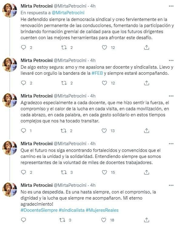 La dirigente gremial Mirta Petrocini informó a través de su cuenta de Twitter que tras casi dos décadas decidió no renovar su mandato al frente de la FEB. "No es una despedida. Es una hasta siempre, con el compromiso, la dignidad y la lucha que siempre me acompañaron. ¡Mi eterno agradecimiento!", escribió.
