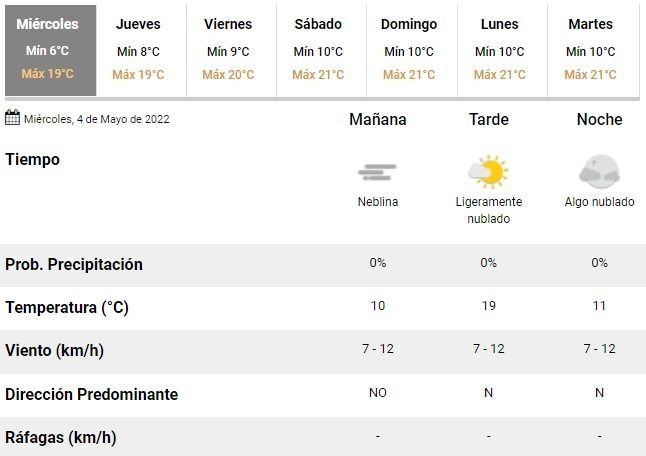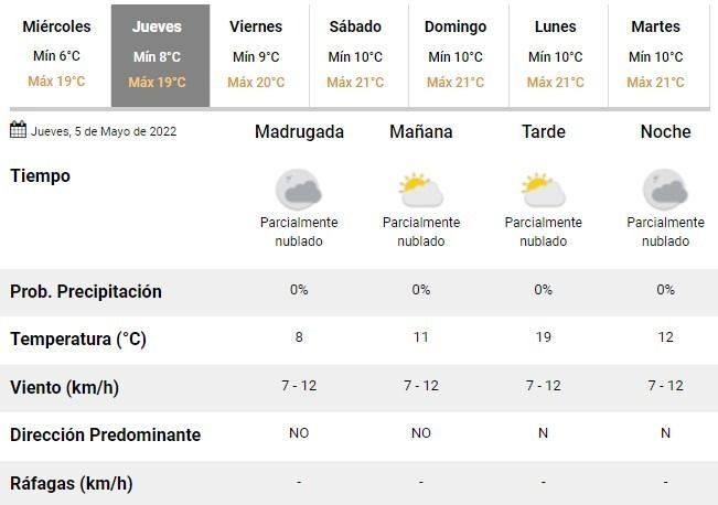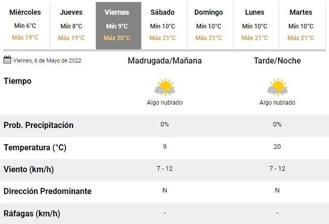 Para el fin de semana, en tanto, se prevén excelentes condiciones de tiempo, sin lluvias en el horizonte y con cielos algo a parcialmente nublados, con una temperatura ideal rondando los 10°C de mínima y los 21°C de máxima durante las dos jornadas de descanso.