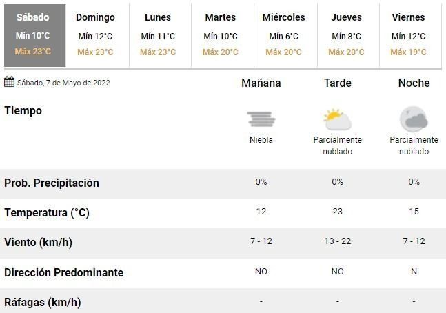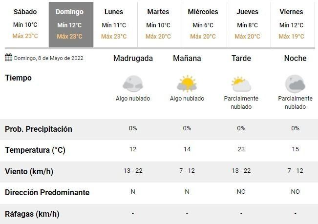 Para el domingo, por su parte, se espera una jornada con 12°C de mínima y 23°C de máxima. El excelente tiempo será una constante durante todo el día, que transcurrirá algo a parcialmente nublado, con vientos soplando desde el norte a entre 7 y 22 km/h y sin chances de lluvia en el horizonte.